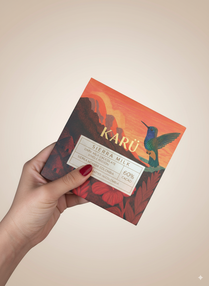 From the sacred mountains of Sierra Nevada de Santa Marta, where indigenous communities have cultivated cacao for generations, comes one of Colombia’s finest varieties. This 60% dark milk chocolate is smooth, rich, and full of character, a true taste of the mountains and the people who protect them.